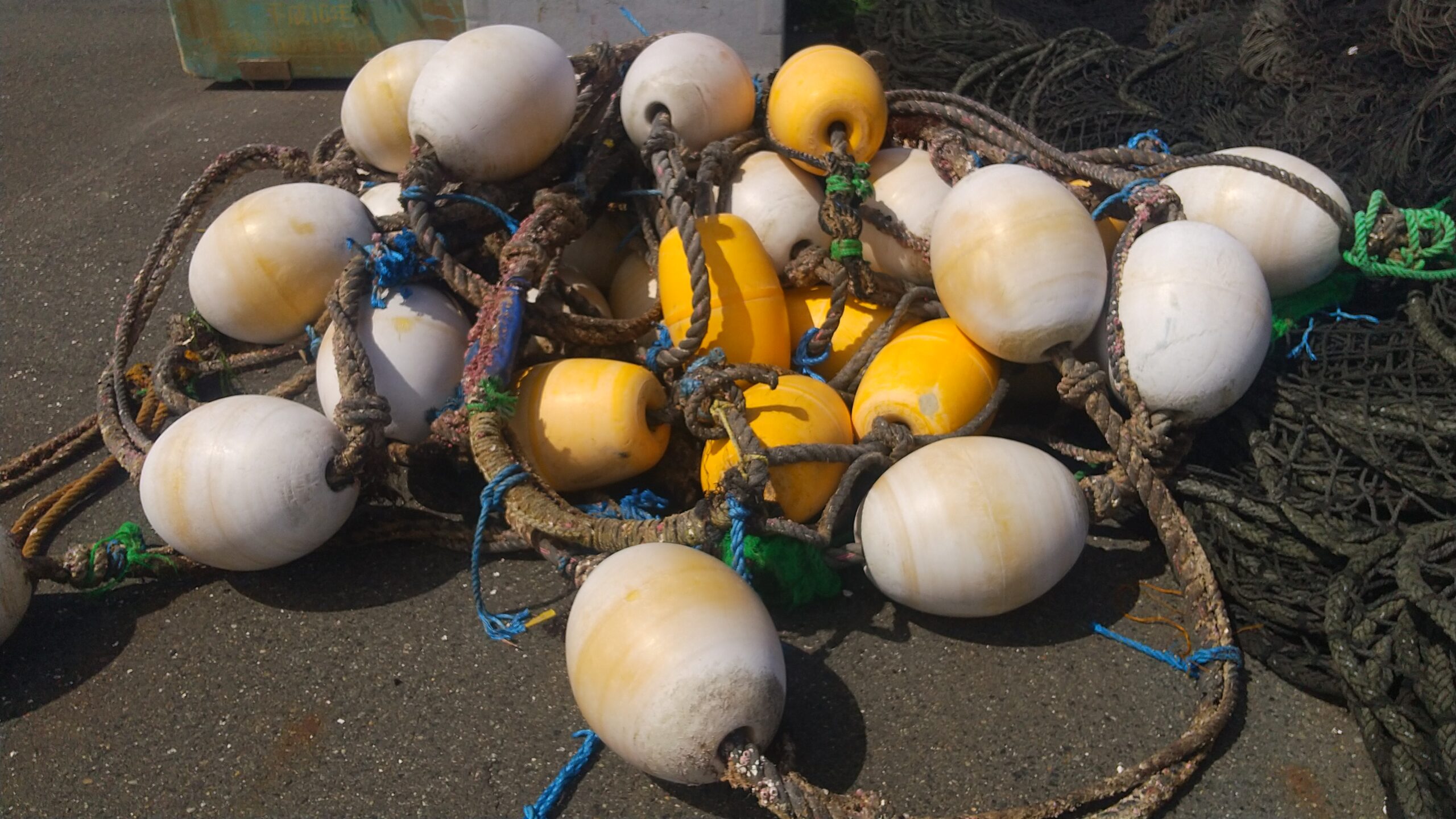 1.発泡スチロールブイ(EPSブイ):養殖業などで使われる白い軽量な浮き。リサイクル適性は高いですが、劣化してボロボロ崩れやすく、飛散対策が必要です。