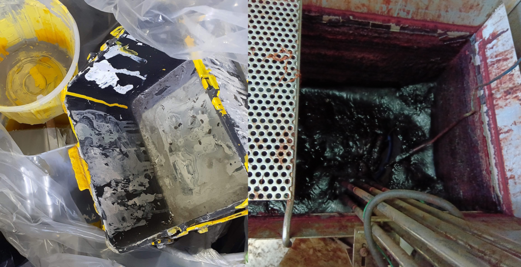 「固まってないもの」は、液体のまま焼却炉へ噴霧するか、再生重油としてリサイクル(サーマルリサイクル)します。「固まったもの」は、容器から取り出して廃プラとして焼却・埋立するか、一斗缶ごと破砕して金属と可燃物に分離処理します。